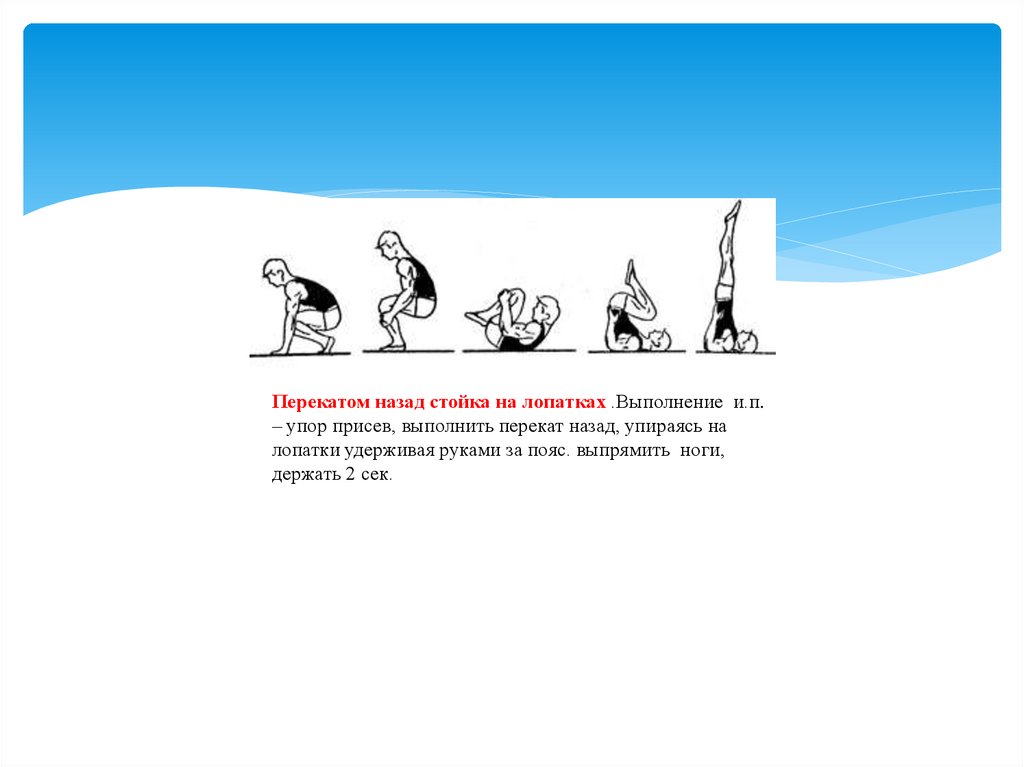 Перекатом назад стойка на лопатках .Выполнение и.п.– упор присев, выполнить перекат назад, упираясь на