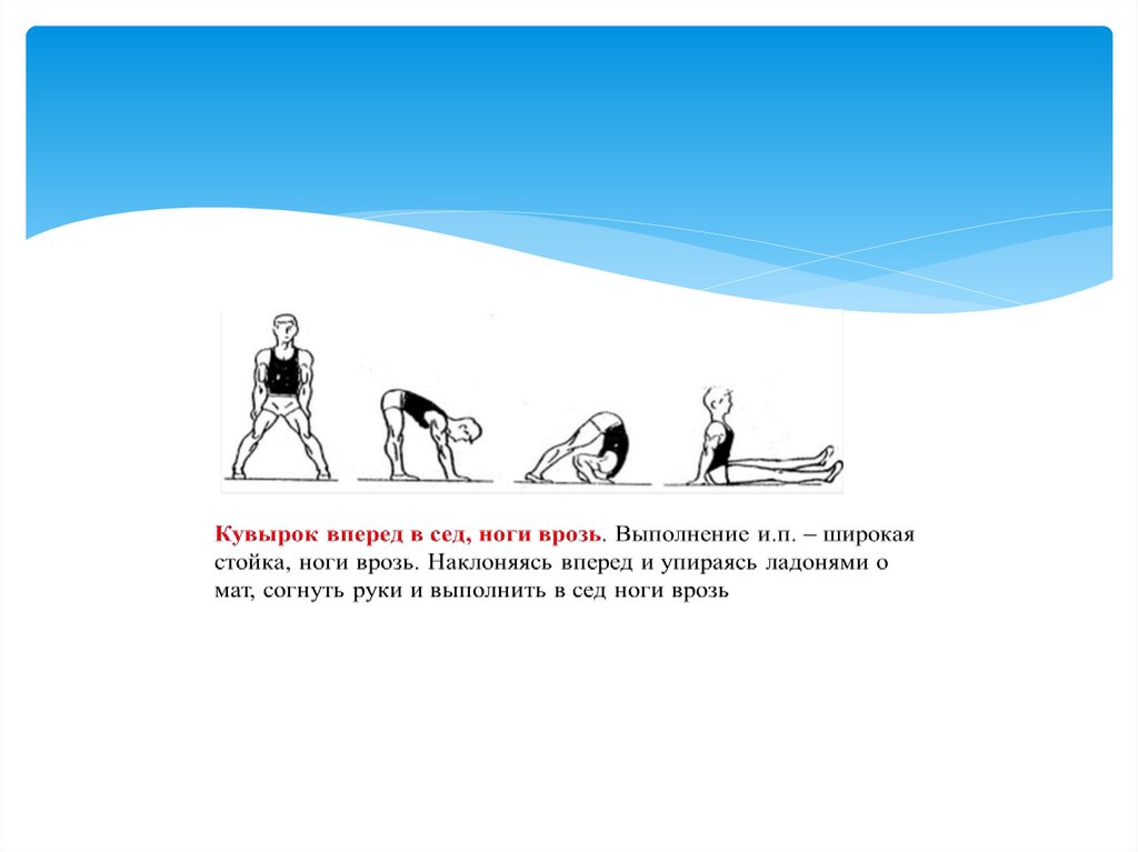 1. КУВЫРОК ВПЕРЕД – ПРЫЖОК ВВЕРХ (вариант)Выполнение: после отталкивания держать ноги прямые, следить за плотной