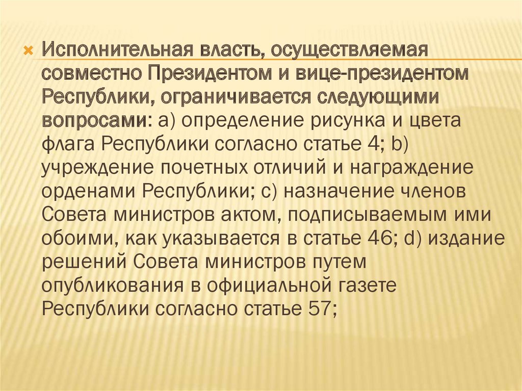 Исполнительная власть, осуществляемаясовместно Президентом и вице-президентом
