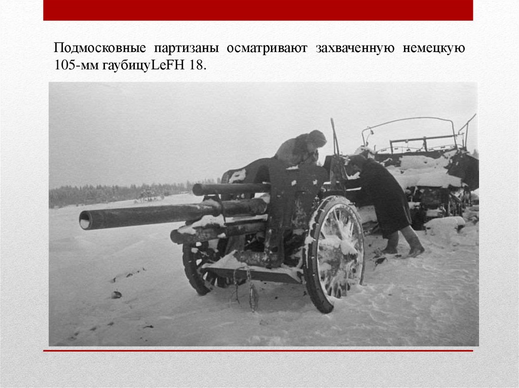 Подмосковные партизаны осматривают захваченную немецкую105-мм гаубицуLeFH 18.