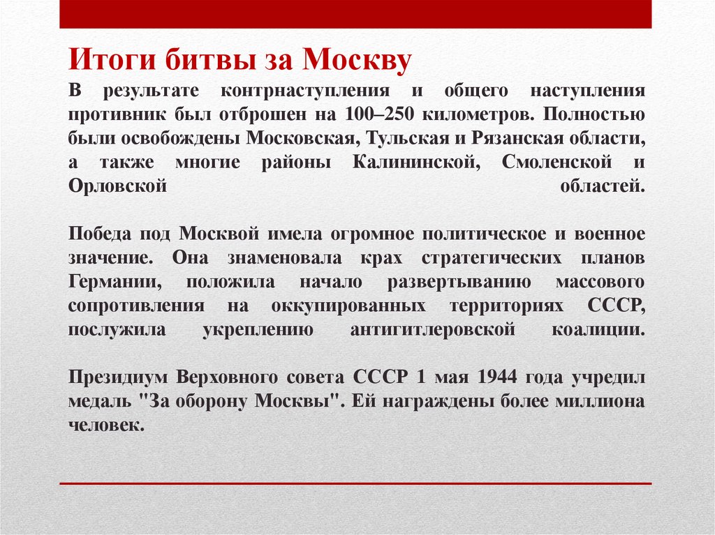Итоги битвы за МосквуВ результате контрнаступления и общего наступления