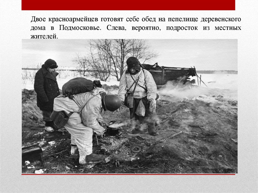 Двое красноармейцев готовят себе обед на пепелище деревенскогодома в Подмосковье. Слева, вероятно, подросток из местных