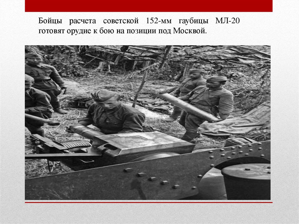 Бойцы расчета советской 152-мм гаубицы МЛ-20готовят орудие к бою на позиции под Москвой.