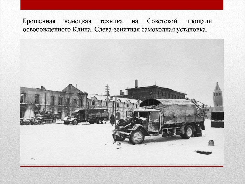 Брошенная немецкая техника на Советской площадиосвобожденного Клина. Слева-зенитная самоходная установка.