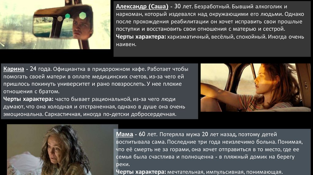 Александр (Саша) - 30 лет. Безработный. Бывший алкоголик инаркоман, который издевался над окружающими его людьми. Однако