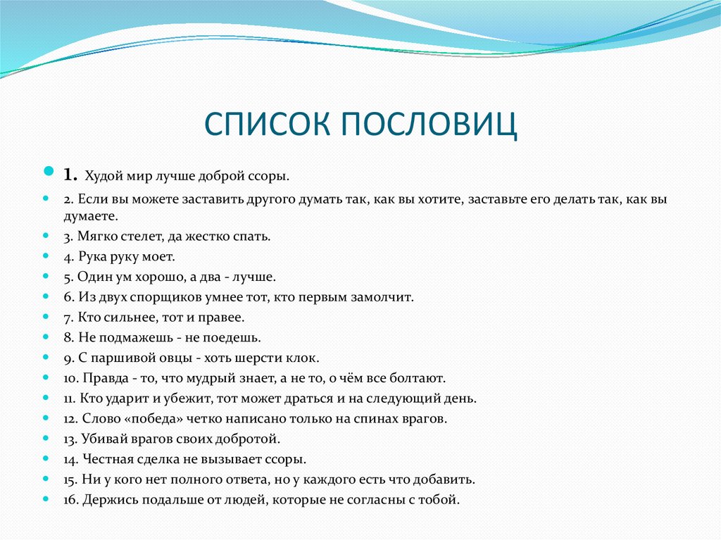 СПИСОК ПОСЛОВИЦ1. Худой мир лучше доброй ссоры.