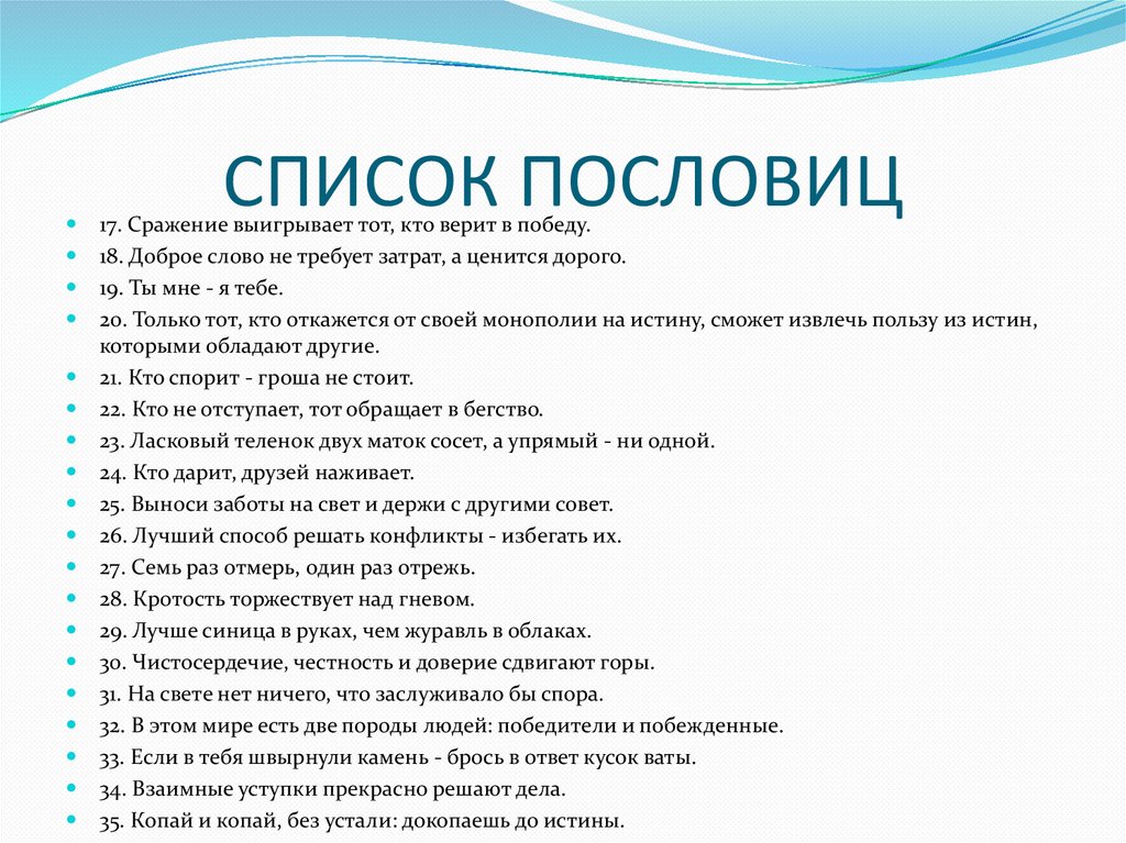СПИСОК ПОСЛОВИЦ17. Сражение выигрывает тот, кто верит в победу.