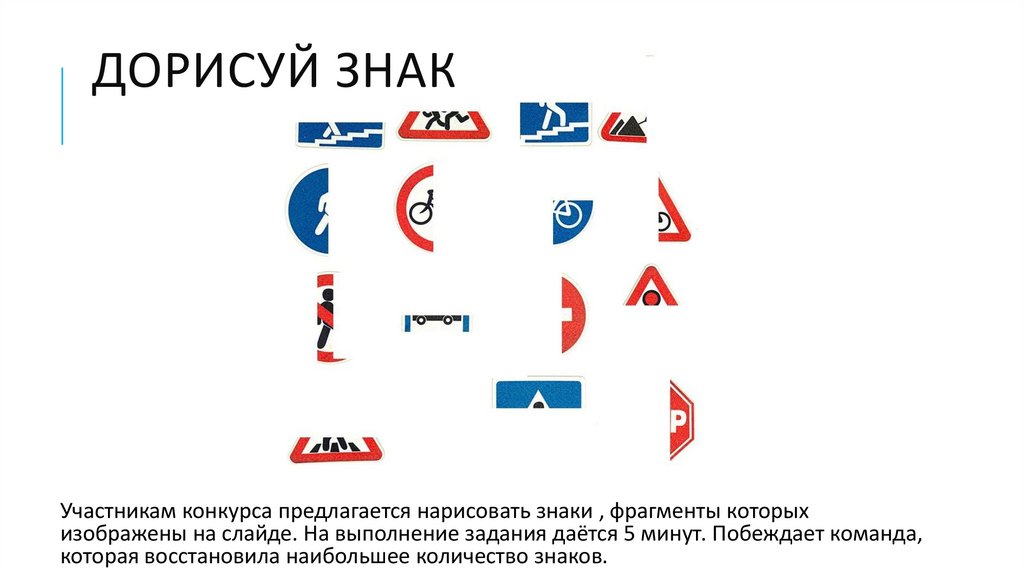ДОРИСУЙ ЗНАКУчастникам конкурса предлагается нарисовать знаки , фрагменты которых