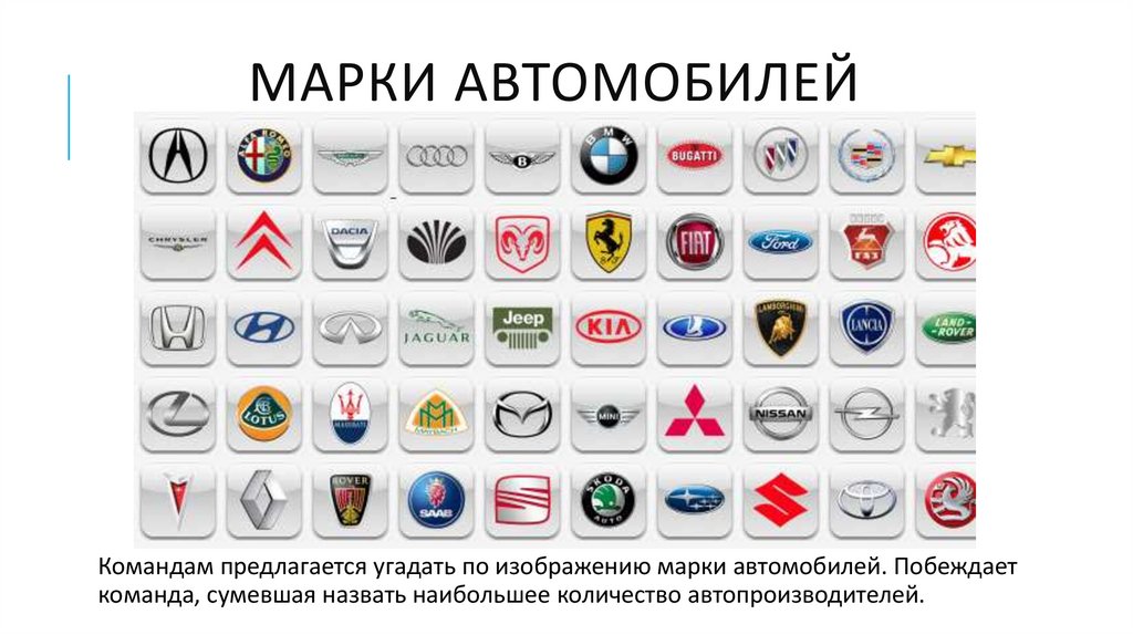 МАРКИ АВТОМОБИЛЕЙКомандам предлагается угадать по изображению марки автомобилей. Побеждает