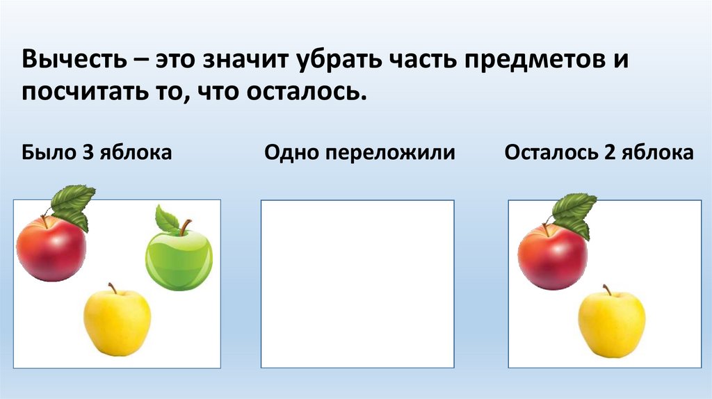 Вычесть – это значит убрать часть предметов ипосчитать то, что осталось.