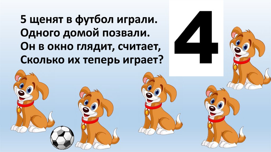 5 щенят в футбол играли.Одного домой позвали.