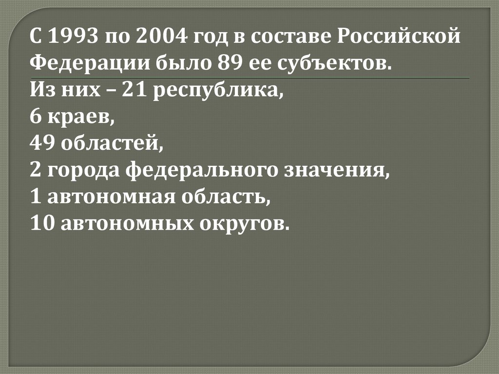 С 1993 по 2004 год в составе РоссийскойФедерации было 89 ее субъектов.