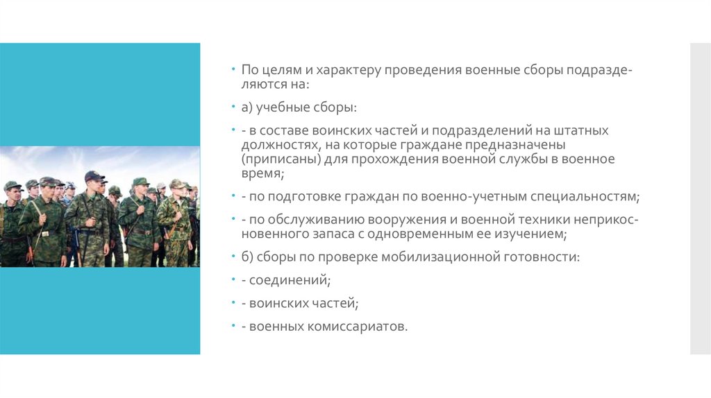 По целям и характеру проведения военные сборы подразделяются на:а) учебные сборы: