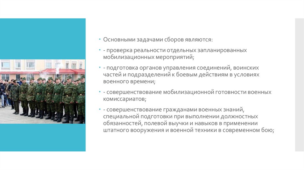 Основными задачами сборов являются:- проверка реальности отдельных запланированных