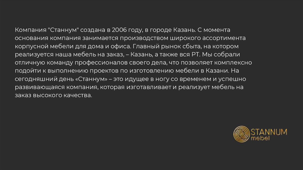 Компания "Станнум" создана в 2006 году, в городе Казань. С моментаоснования компания занимается производством широкого ассортимента