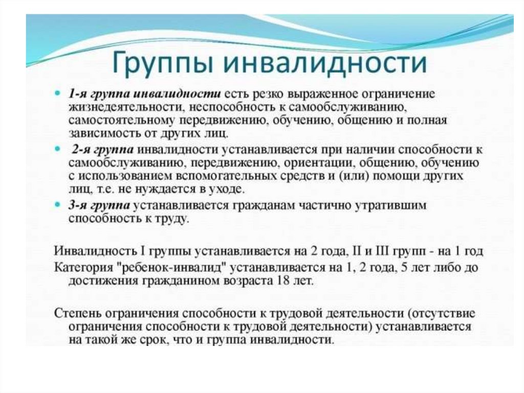 Понятие инвалидности, порядок её установления. Группы инвалидности, их юридическое значение