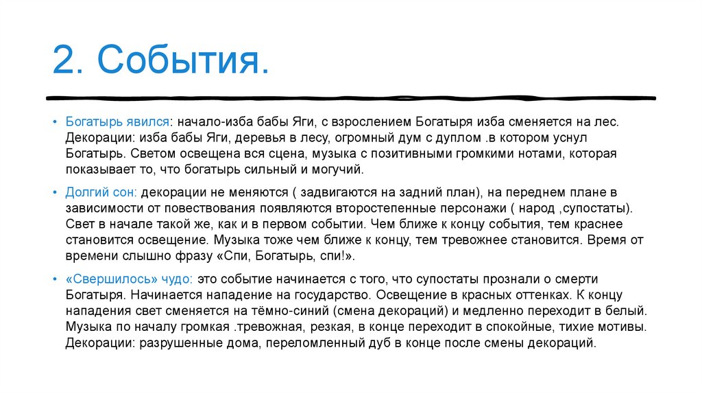 2. События.• Богатырь явился: начало-изба бабы Яги, с взрослением Богатыря изба сменяется на лес.