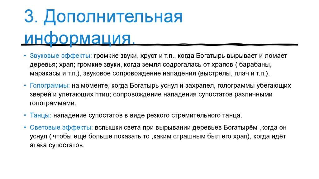 • Звуковые эффекты: громкие звуки, хруст и т.п., когда Богатырь вырывает и ломает