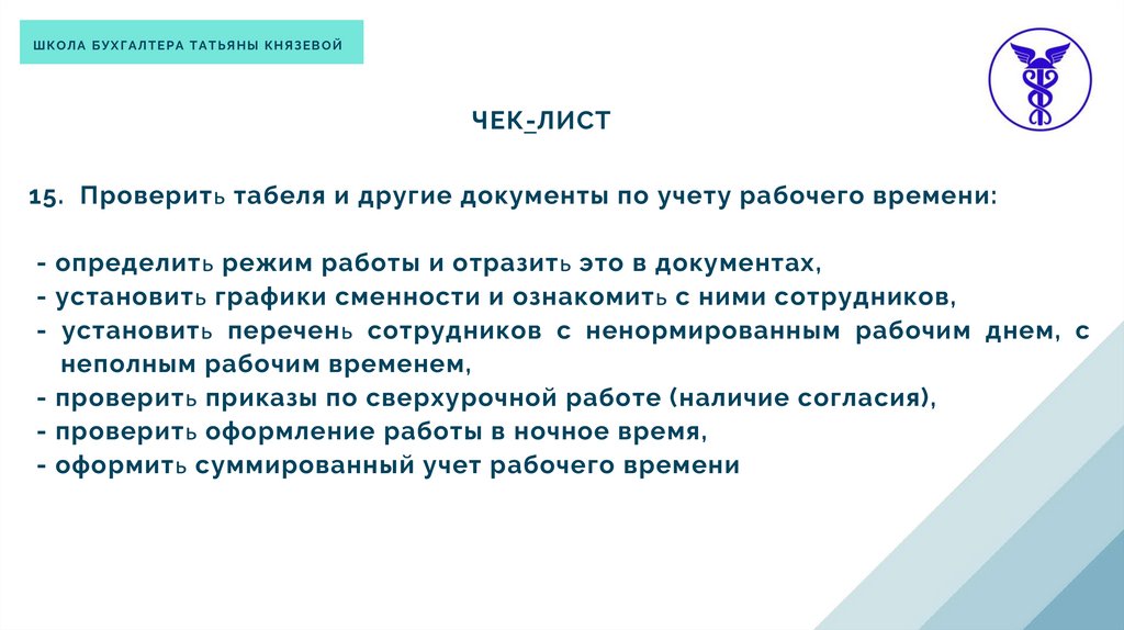 15. Проверить табеля и другие документы по учету рабочего времени: