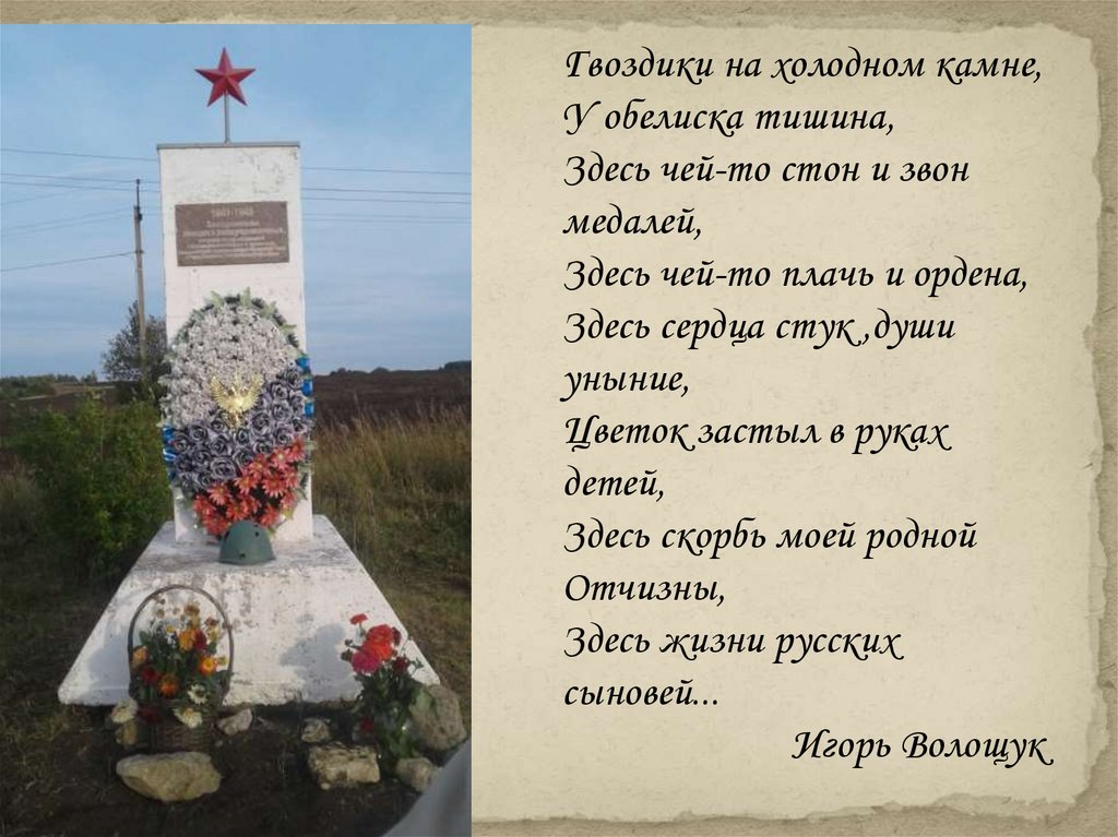 Гвоздики на холодном камне,У обелиска тишина,