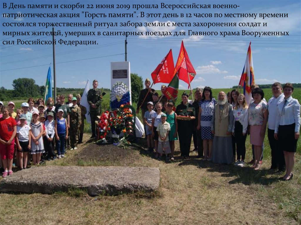 В День памяти и скорби 22 июня 2019 прошла Всероссийская военнопатриотическая акция "Горсть памяти". В этот день в 12 часов по местному временисостоялся торжественный ритуал забора земли с места захоронения солдат и