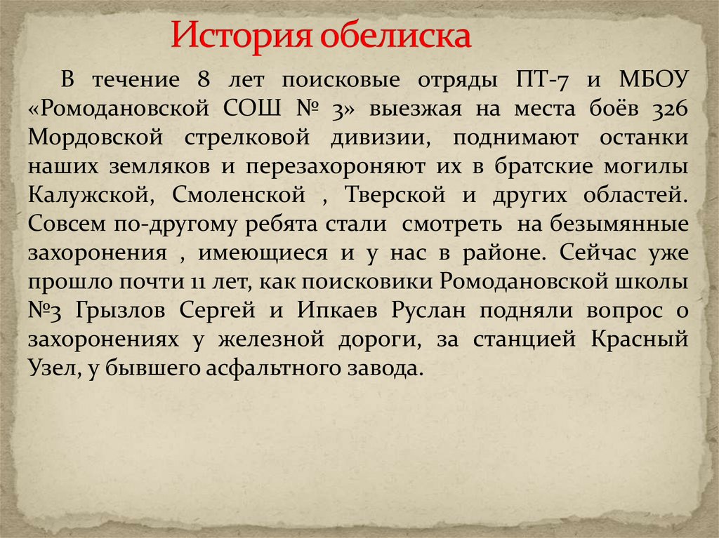 В течение 8 лет поисковые отряды ПТ-7 и МБОУ«Ромодановской СОШ № 3» выезжая на места боёв 326
