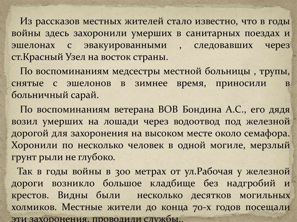 Из рассказов местных жителей стало известно, что в годывойны здесь захоронили умерших в санитарных поездах и