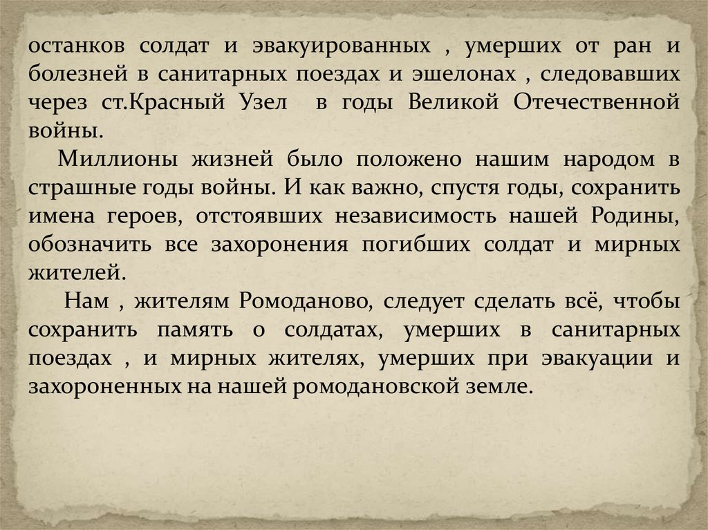 останков солдат и эвакуированных , умерших от ран иболезней в санитарных поездах и эшелонах , следовавших