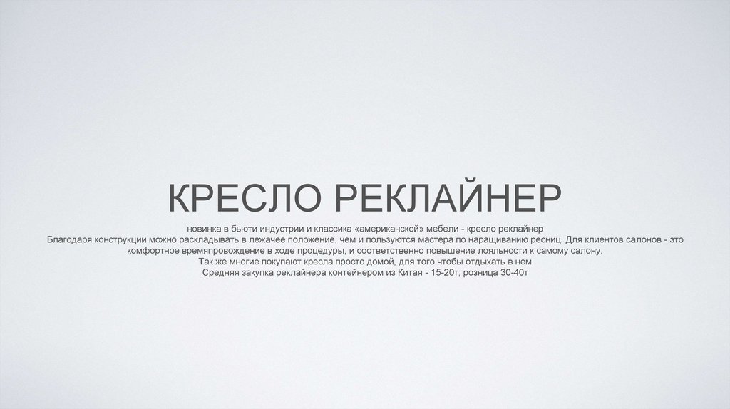 Средняя закупка реклайнера контейнером из Китая - 15-20т, розница 30-40т
