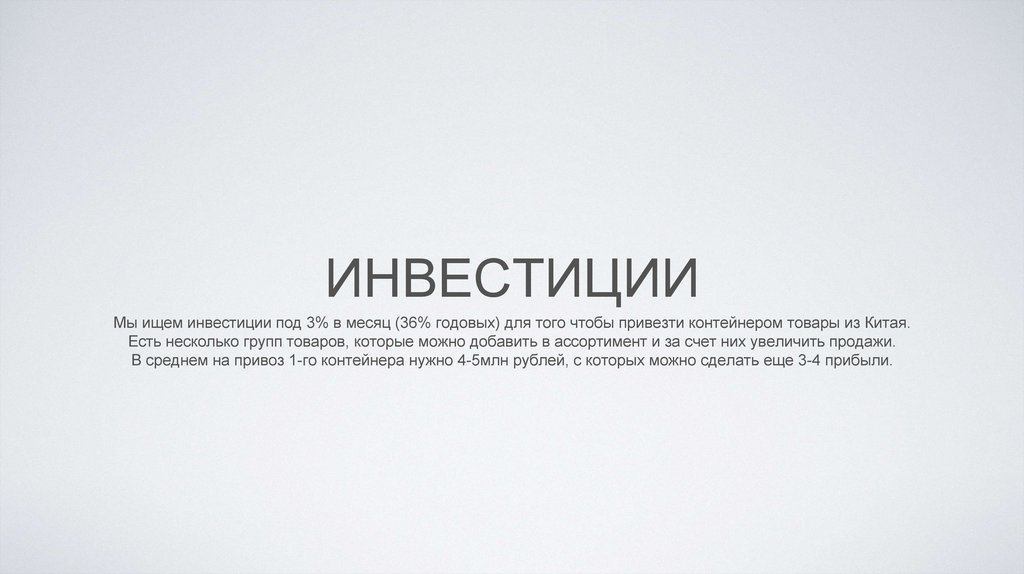 ИНВЕСТИЦИИМы ищем инвестиции под 3% в месяц (36% годовых) для того чтобы привезти контейнером товары из Китая.