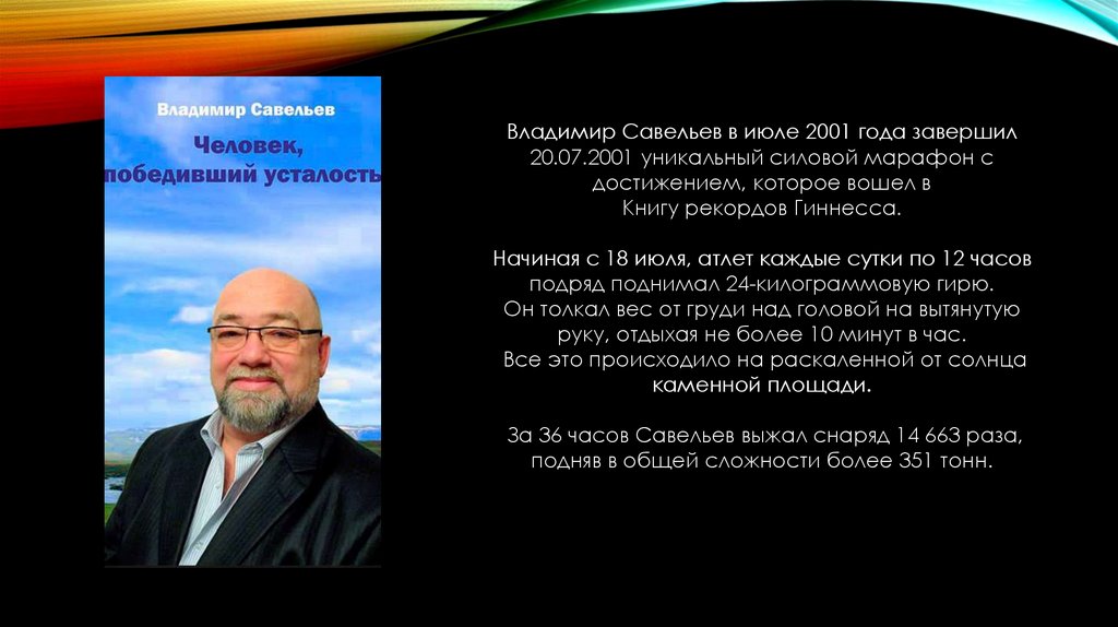 Владимир Савельев в июле 2001 года завершил20.07.2001 уникальный силовой марафон с