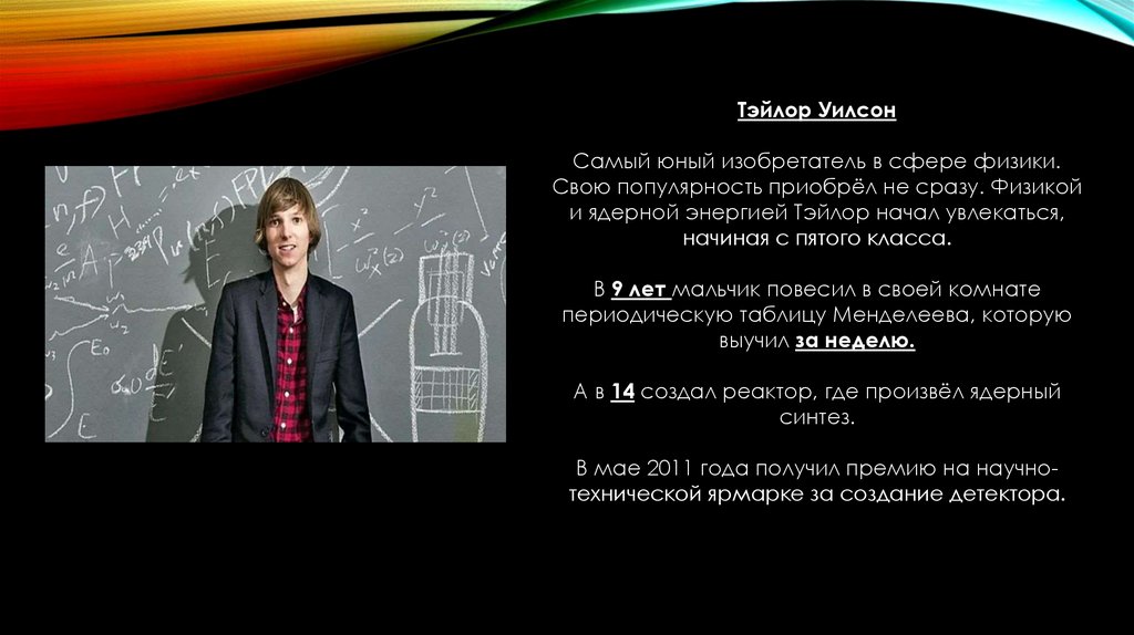 Тэйлор УилсонСамый юный изобретатель в сфере физики.