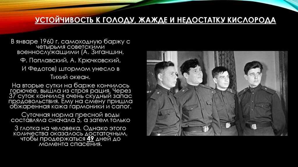 УСТОЙЧИВОСТЬ К ГОЛОДУ, ЖАЖДЕ И НЕДОСТАТКУ КИСЛОРОДАВ январе 1960 г. самоходную баржу с