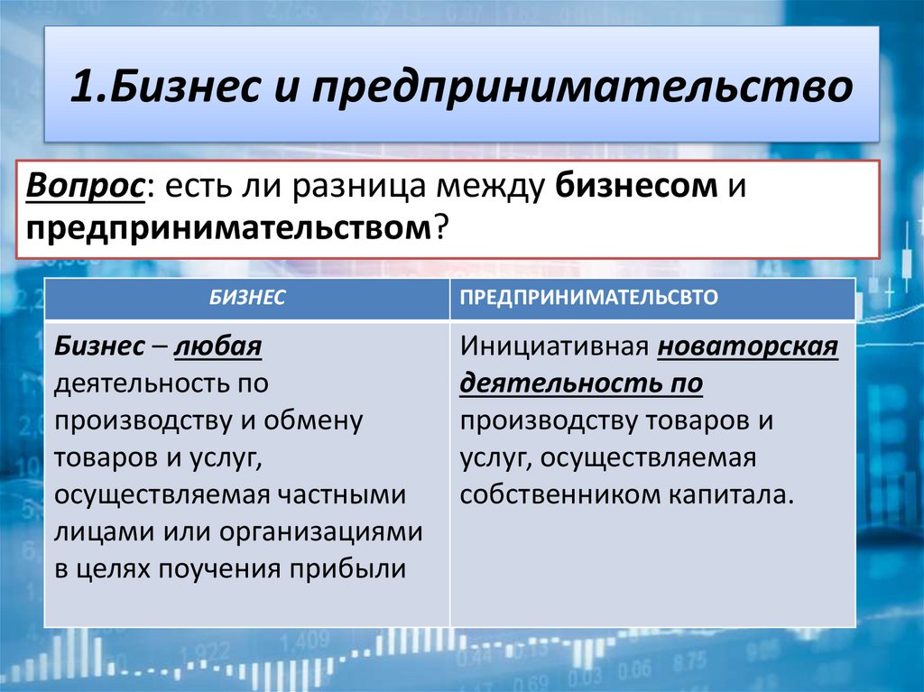1.Бизнес и предпринимательствоВопрос: есть ли разница между бизнесом и