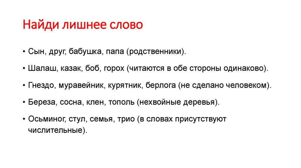 Найди лишнее слово• Сын, друг, бабушка, папа (родственники).