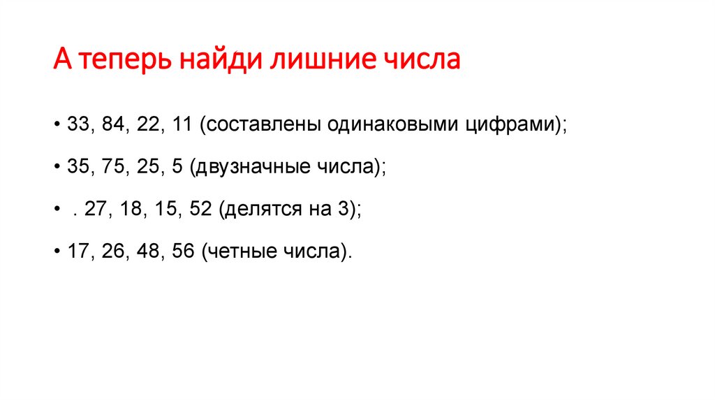 А теперь найди лишние числа• 33, 84, 22, 11 (составлены одинаковыми цифрами);