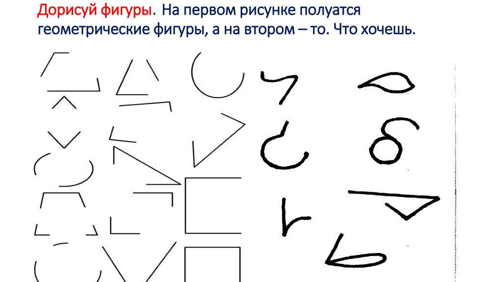 Дорисуй фигуры. На первом рисунке полуатсягеометрические фигуры, а на втором – то. Что хочешь.