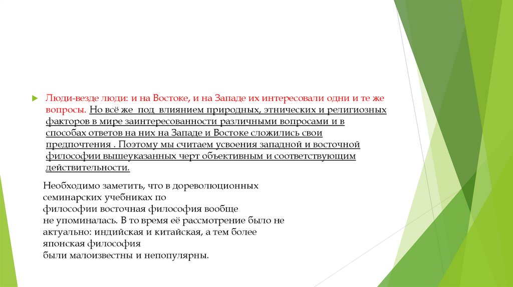 Люди-везде люди: и на Востоке, и на Западе их интересовали одни и те жевопросы. Но всё же под влиянием природных, этнических и религиозных