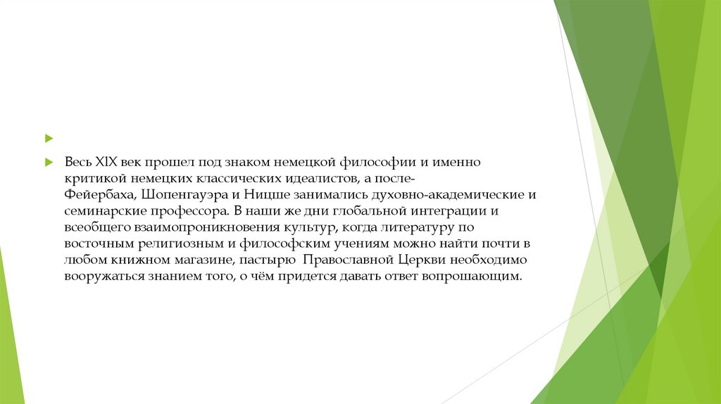 Весь ХlХ век прошел под знаком немецкой философии и именнокритикой немецких классических идеалистов, а послеФейербаха, Шопенгауэра и Ницше занимались духовно-академические и