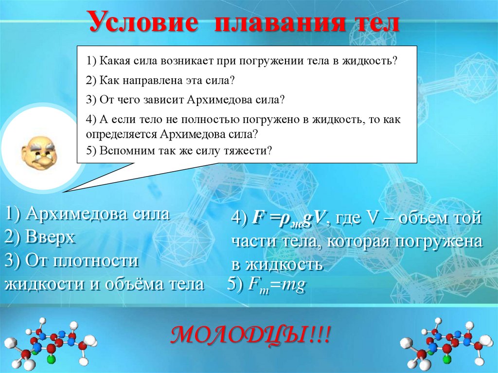 Условие плавания тел1) Какая сила возникает при погружении тела в жидкость?