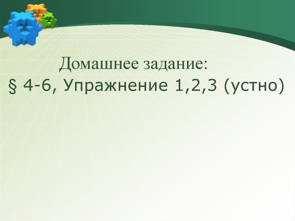 Домашнее задание:§ 4-6, Упражнение 1,2,3 (устно)