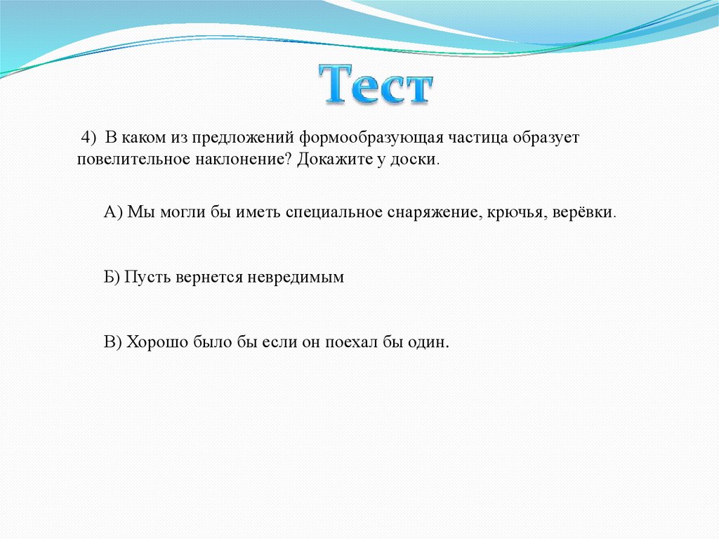 4) В каком из предложений формообразующая частица образуетповелительное наклонение? Докажите у доски.