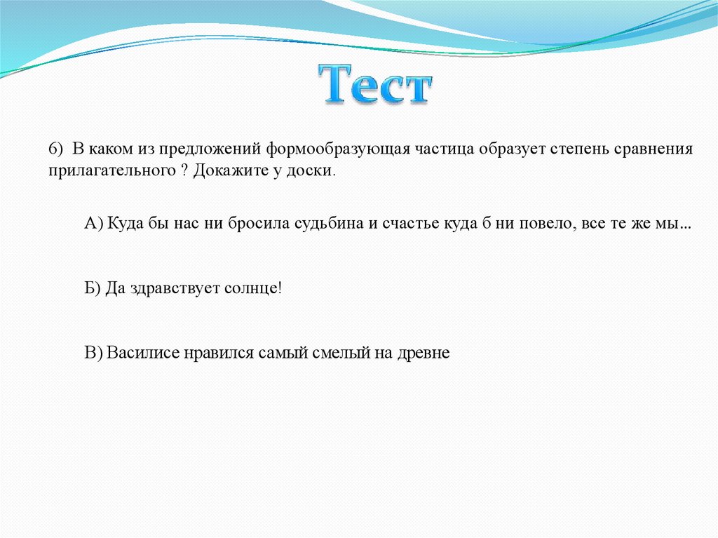 6) В каком из предложений формообразующая частица образует степень сравненияприлагательного ? Докажите у доски.