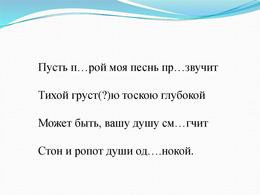 Пусть п…рой моя песнь пр…звучитТихой груст(?)ю тоскою глубокой
