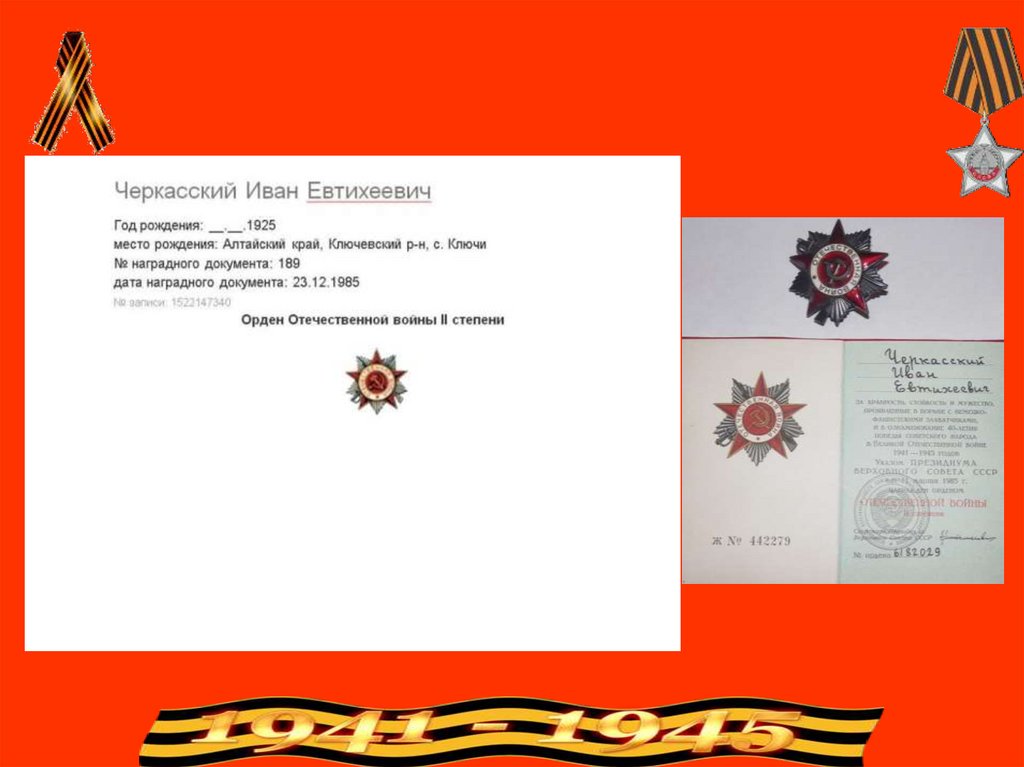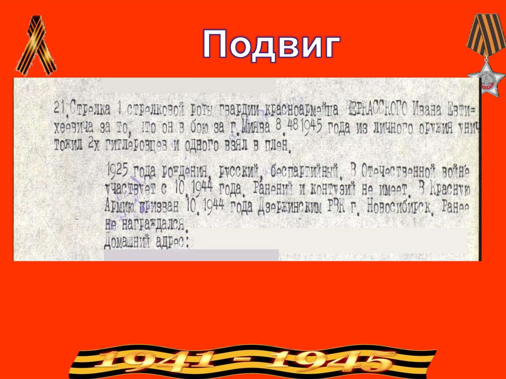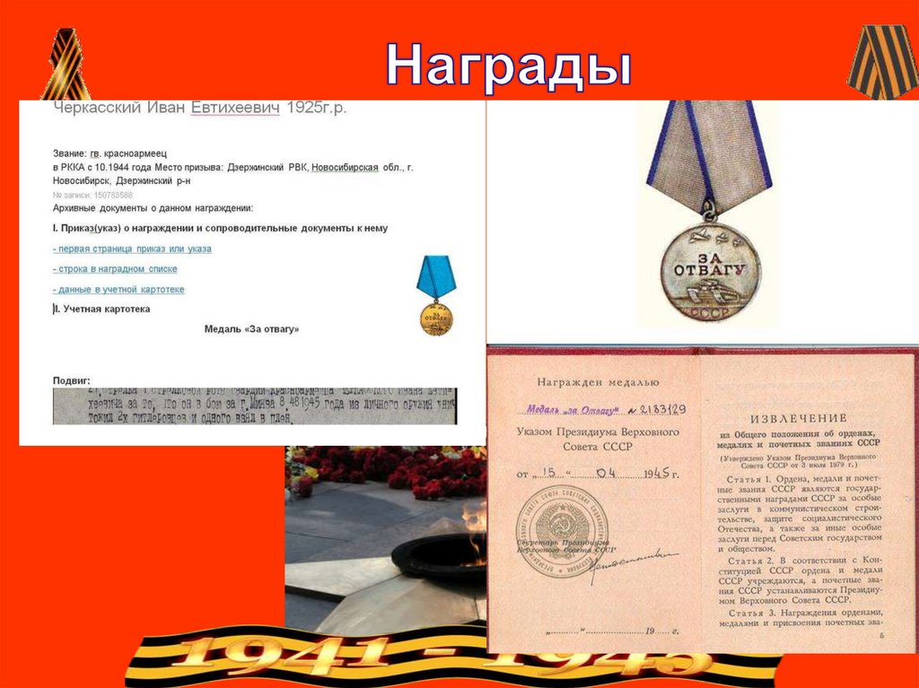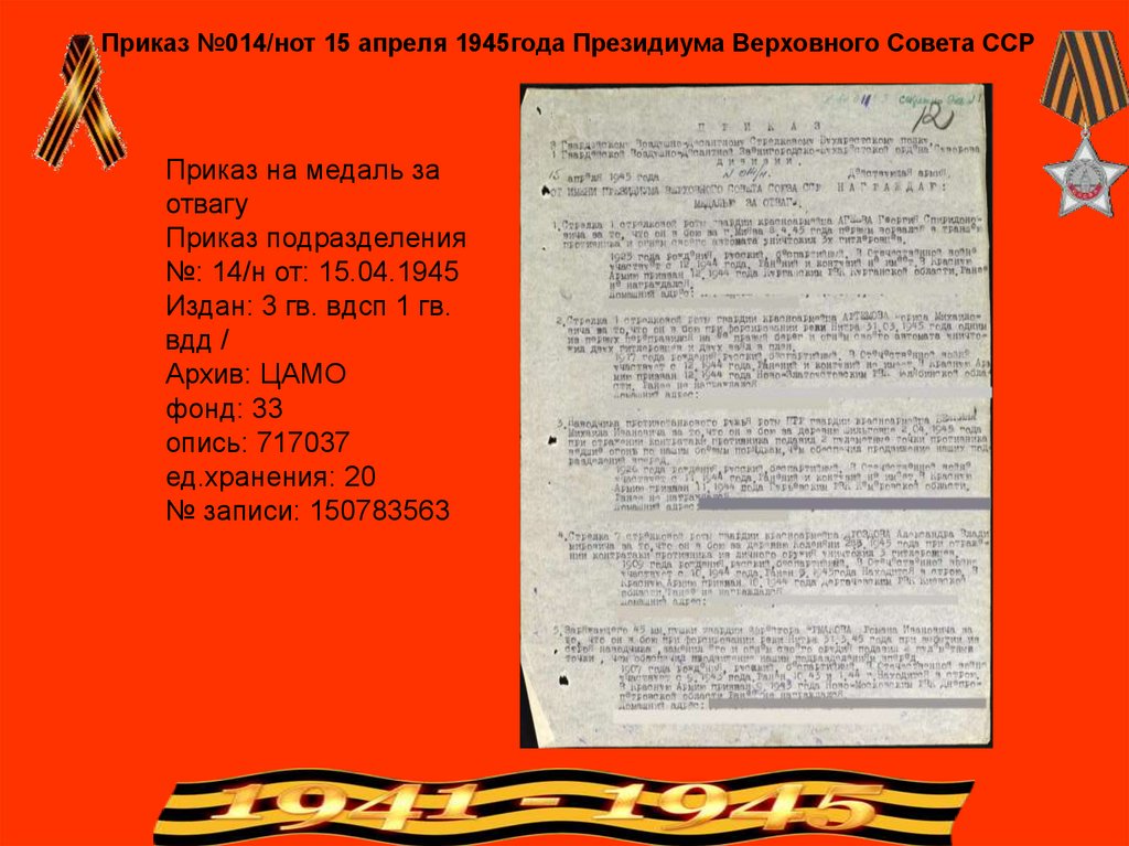Приказ №014/нот 15 апреля 1945года Президиума Верховного Совета ССРПриказ на медаль за
