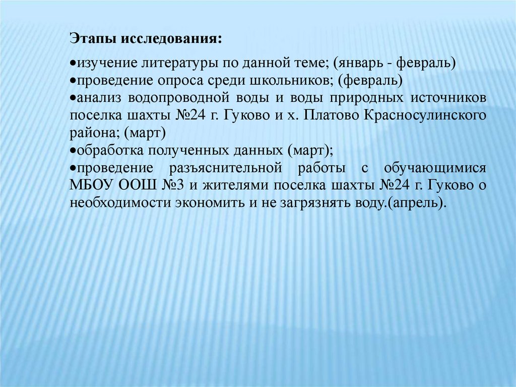 Этапы исследования:изучение литературы по данной теме; (январь - февраль)