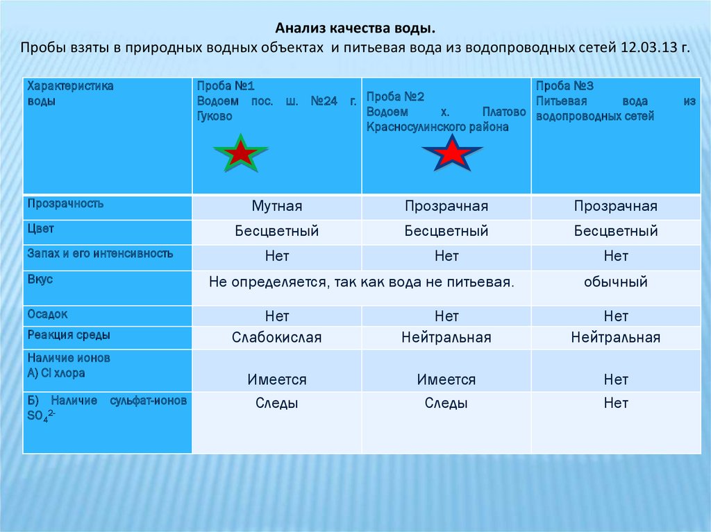 Анализ качества воды.Пробы взяты в природных водных объектах и питьевая вода из водопроводных сетей 12.03.13 г.