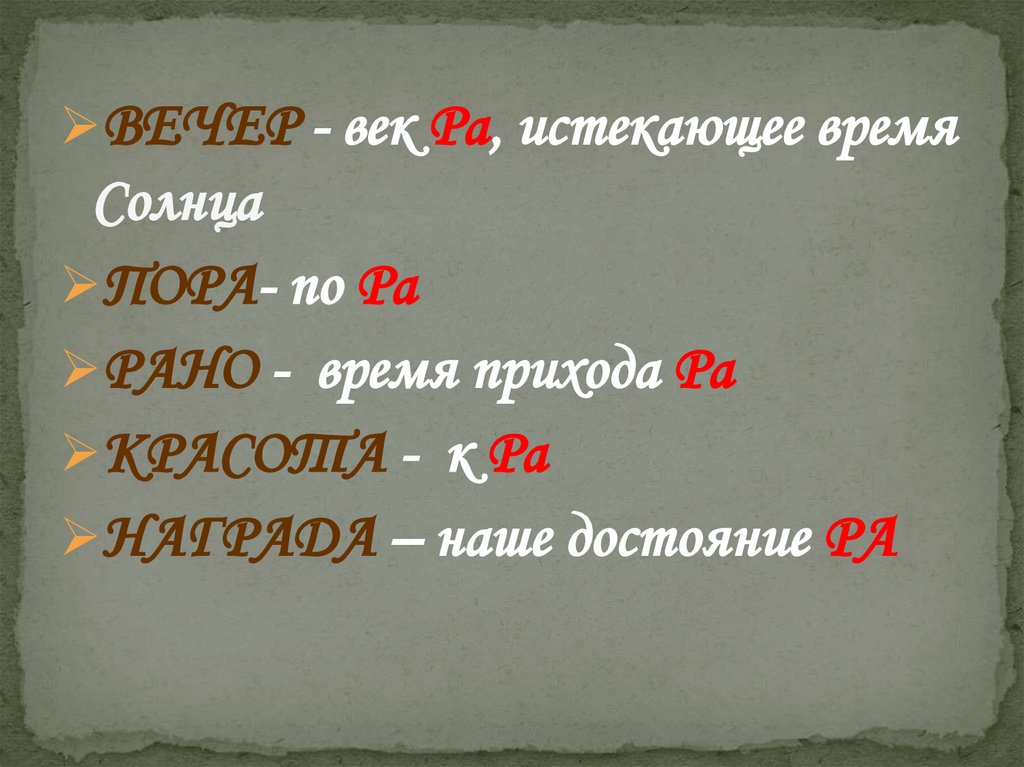 ВЕЧЕР - век Ра, истекающее времяСолнца