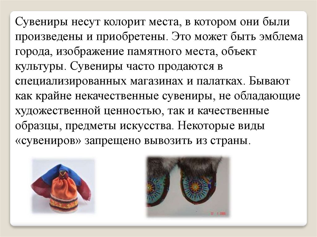 Сувениры несут колорит места, в котором они былипроизведены и приобретены. Это может быть эмблема