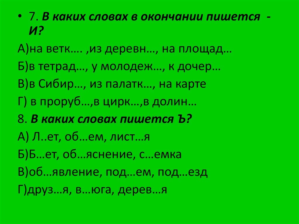 • 7. В каких словах в окончании пишется И?А)на ветк…. ,из деревн…, на площад…